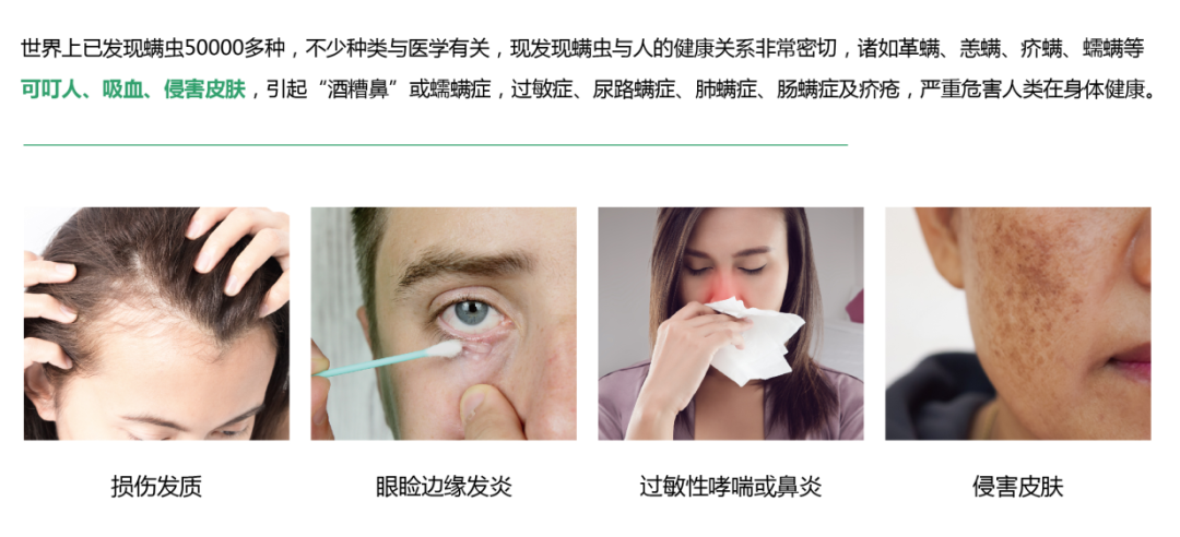 “螨虫是皮肤健康的杀手”,有关专家已明确指出。目前,成年人的螨虫感染率已高达97%以上,螨虫已成为继苍蝇、跳蚤之后危害人类健康的又一大害虫。在居室的阴暗角落、地毯、床垫、枕头、沙发、空调里,都能发现螨虫。