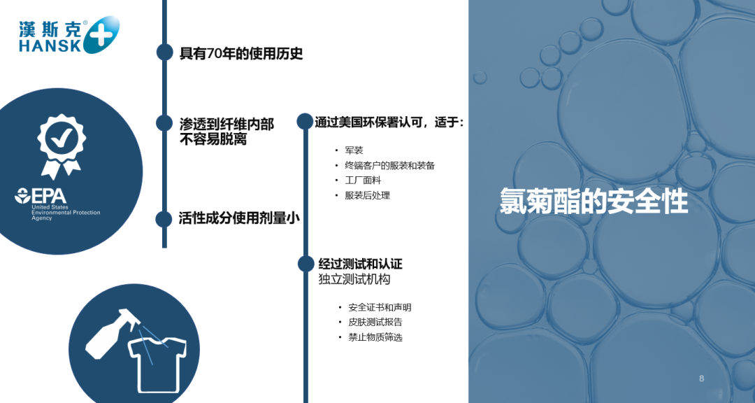 人类社会中,一些科学家洞察到这个原理后,通过人工合成的方式,在实验室中成功制作出“人造菊酯”,也即“氯菊酯”,到今天为止,氯菊酯已有70年的使用历史,所以它的安全性已经过时间考验,可放心使用。汉斯克在此基础上,研发出以氯菊酯作为活性成分的Vital Protection,具有防蚊虫、防螨和抗菌功效,经Vital Protection处理后的纺织品,可提高防蚊虫驱蚊虫效果,具有双重击倒和排斥性能。汉斯克Vital Protection防蚊虫防螨抗菌纺织助剂的应用说明,可参考以下视频:作为在纺织品行业持续二十多年并坚守防蚊虫领域的一家高新科技企业,我们以关爱人类健康为宗旨,致力于向大众宣传纺织品防蚊虫的重要性。如果您有这方面的困扰,可以与我们联系,我们将为您提供整套纺织品整理技术解决方案,协助提升您在防蚊虫服装行业内的价值。